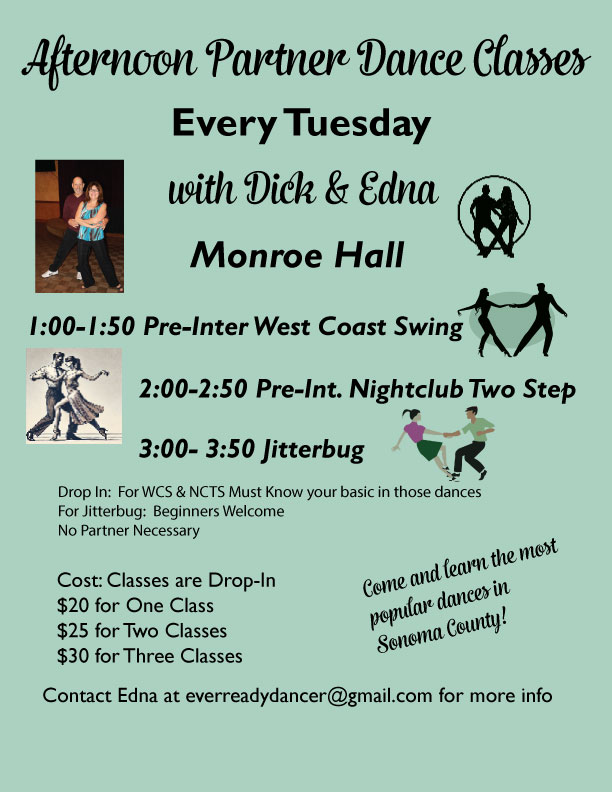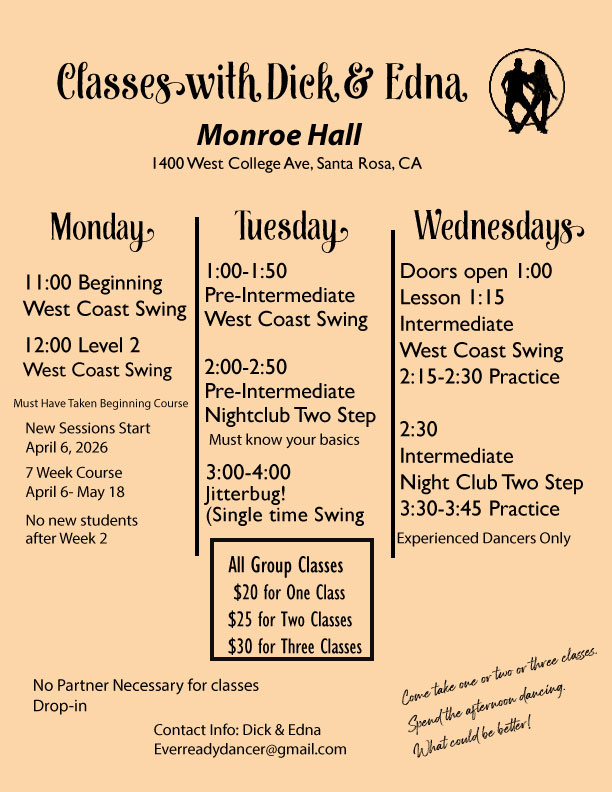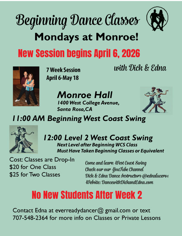 Learn rhythm, timing, and simple turns to get comfortable on the social dance floor. Great for first-time dancers or those brushing up their basics. Next session starts on January 5th. Please contact Dick and Edna to let them know you plan to attend.