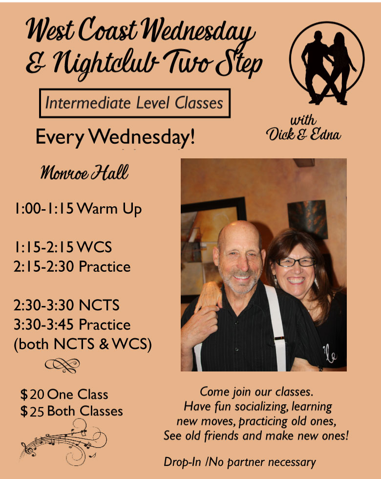 Join us for Pre-Intermediate West Coast Swing and Pre-Intermediate Nightclub Two Step fun!
