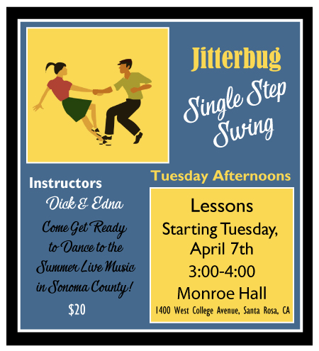 3:00-4:00 Jitterbug with Edna and Brad (Dick had hip surgery and is recuperating. Brad is teaching for him so we can still have the class).